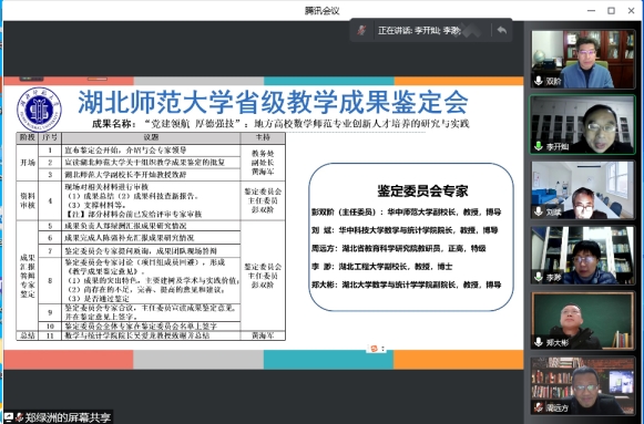 2月16日,数学与统计学院申报第九届湖北省教学成果奖成果鉴定会在线上举行。鉴定委员会委员由华中师范大学副校长彭双阶教授(主任委员)、华中科技大学数学与统计学院院长刘斌教授、湖北工程大学副校长李渺教授、湖北省教育科学研究院周远方教授(正高、特级)、湖北大学数学与统计学学院副院长郑大彬教授等5位专家组成。鉴定会由教务处副处长黄海军主持,304am永利集团党委常委李开灿教授致欢迎辞,成果全体完成人参加会议。