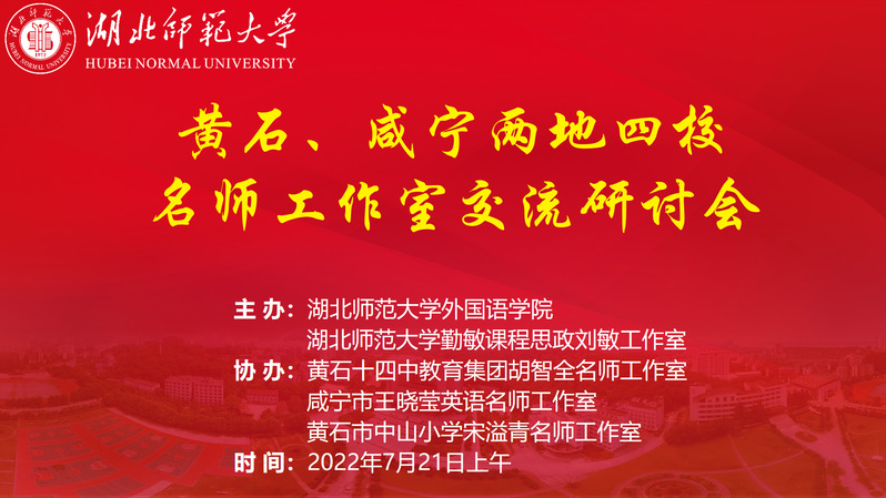 2022年7月21日上午,为深化高校与中小学合作共赢的“三位一体”协同培养机制,打造教师培养、培训、研究和服务一体化的合作共同体,实现高校名师工作室与基础教育中小学名师工作室的对接协作与深度交流,外国语学院在充分发挥国家级课程思政教学名师团队刘敏工作室“走出去”省内省外辐射示范作用的同时,将黄石、咸宁两地中小学英语名师工作室“请进来”,于人文楼21B602圆满举办“黄石、咸宁两地四校名师工作室交流研讨会”,旨在促进黄石、咸宁两地英语教育教学相互交流和同步发展,加强各名师工作室之间的合作学习与智慧共享。