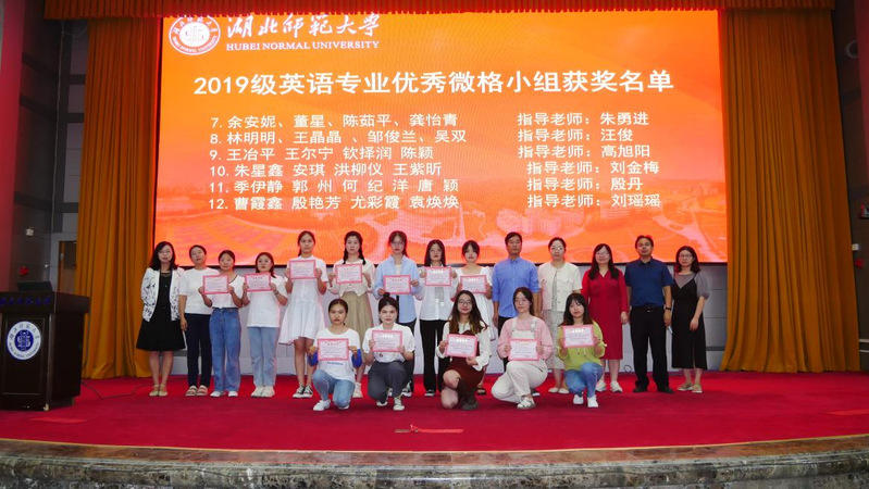 会议伊始,朱勇进主任向同学们通报了304am永利集团优秀毕业生刘米竹同学荣获深圳市2022年度基础教育年度教师喜讯,借此对实习生工作的开展予以诚挚的期盼与建议。随后,刘瑶瑶老师宣读了2019级英语专业教学微格优秀总结获奖名单,全体获奖学生和优秀指导老师上台领奖并合影。