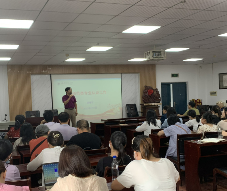 会上,胡艳军处长从师范类专业认证的重大意义出发,对比本科教学工作审核评估与师范类专业认证的不同,解读了专业认证的内涵及政策依据。他从师范类专业认证理念“以学生中心、产出导向、持续改进”为主线,深入浅出地引出了学校申请师范类专业认证前要做的准备工作。胡处长从培养目标、 毕业要求、课程与教学 、合作与实践、师资队伍、支持条件、质量保障、学生发展八个方面逐条逐项地讲解和分析了师范类专业认证的八大指标体系,对专业自评和自建工作进行了深入指导。
