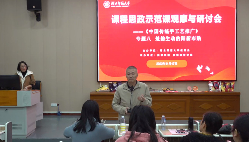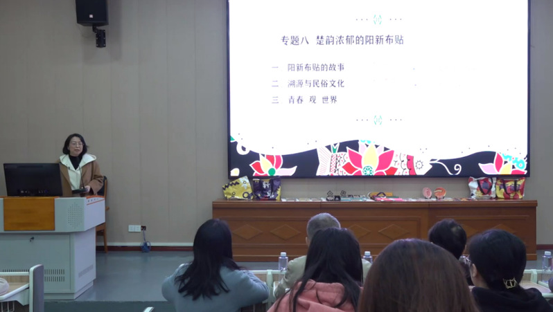 会议分课程示范、交流研讨两个环节。首先,教师教育学院姚菁老师选取《中国传统手工布艺推广》课程中的专题八“楚韵生动的阳新布贴”作了一堂课程思政示范课。她通过视频、小组调研、展示、讲解等方式生动展现了阳新布贴的渊源、分类、色彩和造型,从传统的民间工艺、民俗活动,以及悠久历史等广泛题材出发,挖掘布贴丰富的文化内涵。