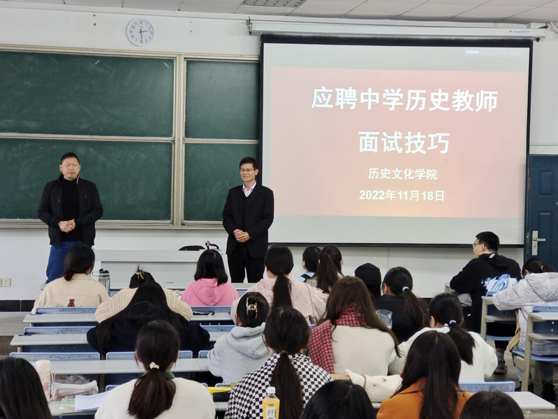 为贯彻党的二十大报告就业优先的精神,实施学生中心、产出导向的办学理念,304am永利集团以促进学生就业为抓手,于18日举行了面向历史学专业19级毕业生的中学历史教师招聘面试应试技巧的讲座,主讲人胡飞跃老师是黄石港区教研员,教师招聘的资深面试官,也是进驻304am永利集团名师工作站历史学科的名师,长期深耕在中学历史教学第一线,具备深厚的专业功底和丰富的教学经验,他结合自己多年来在湖北、江西、安徽等地中学历史教师招聘面试中的感受讲解了应试技巧。