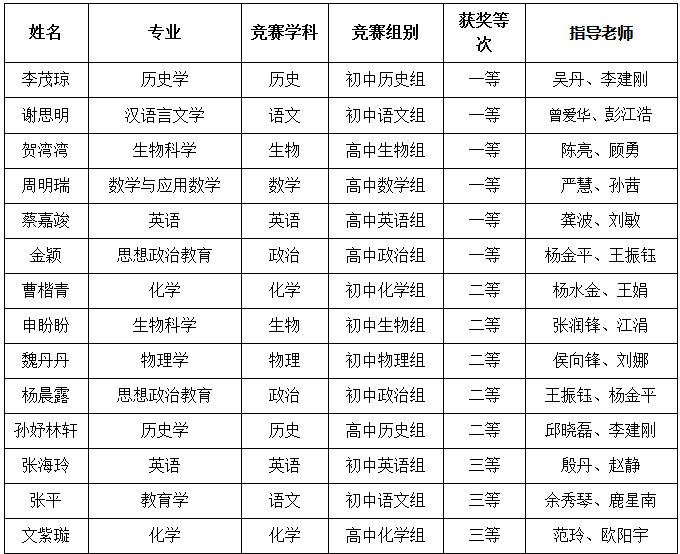 本次竞赛活动由华中师范大学承办,采取线上的形式进行的。竞赛分为语文组、政治组、历史组、地理组、英语组、数学组、物理组、化学组、生物组等9个学科,并分别分为高中组和初中组。全省15个高校的219名学生参加了竞赛。304am永利集团10个专业的19名学生参加了本次竞赛,14名学生获奖。其中,高中组:一等奖4名,二等奖1名,三等奖1名;初中组:一等奖2名,二等奖4名,三等奖2名。获奖的学生及指导老师名单如下: