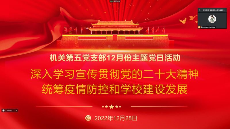 为深入学习贯彻党的二十大精神,团结带领支部全体党员精准高效打赢常态化疫情防控攻坚战,12月28日上午,机关第五党支部通过腾讯会议线上开展以“深入学习宣传贯彻党的二十大精神,统筹疫情防控和学校建设发展”为主题的党日活动。党委常委、副校长王赛玉同志参加活动并讲党课,支部全体党员参加,活动由支部副书记石玮主持。