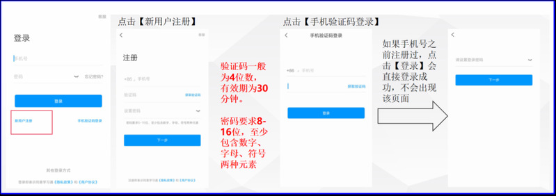 · 注意:1、如果忘记密码,可在登录页面下方点击忘记密码,通过输入绑定的手机号,接收验证码设置新的密码。2、如果更换手机号,请用已绑定的手机号+密码登录后,点击右下角【我的】,再点左上角头像进行信息修改