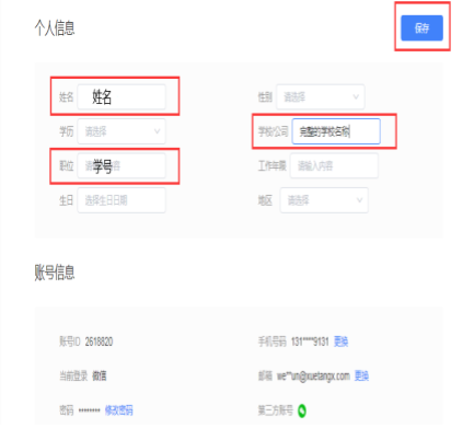 按统一规则修改个人信息,在“姓名”文本框中:录入自己的真实姓名,在“学校/公司”文本框中:录入自己所属学校名称,在“职位”文本框中:录入自己的学号,点击保存;