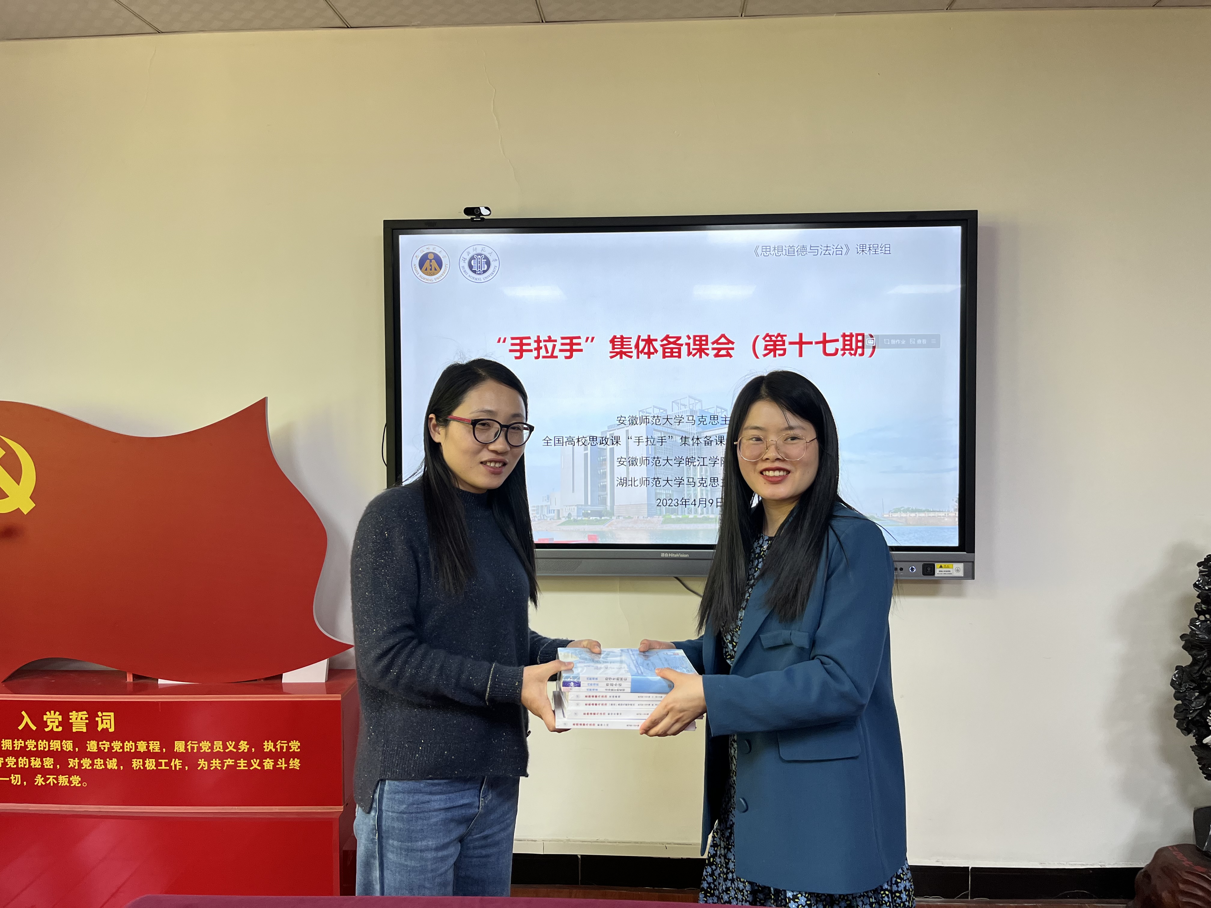 集体备课会后,孙艳秋副教授还代表安徽师范大学马克思主义学院“思想道德与法治”教研室向我院“思想道德与法治”教研室赠送由全国高校思政课名师工作室(安徽师范大学)撰写出版的一套实践教学研究论著。
