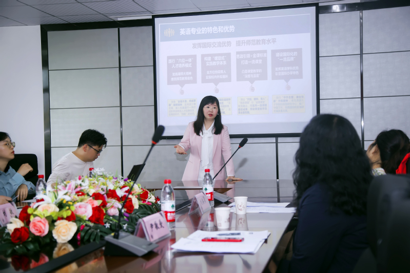 随后,日语系主任杨钢介绍了日语专业建设、人才培养方案制定等相关情况;国家级一流本科课程“职业素养英语”、省级一流本科课程“6小时解码英语新闻听力”负责人伍文忠主任作了“课程建设中教学扮演之设计者”的分享;省级一流课程“基础英语”负责人唐凤华主任分享了该课程历时7年的建设之路;省级一流课程“英语学科教学论”负责人王璐老师分享了该门课程建设的经验。