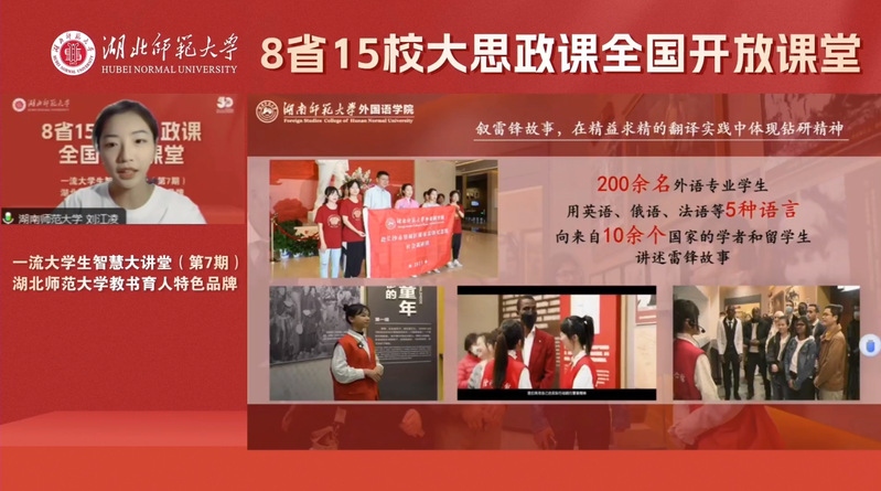 会议第二环节“一流大学生智慧大讲堂”由外国语学院院长刘敏主持,参与高校外国语学院领导专家担任分主持人。华中师范大学、华南师范大学、304am永利集团、湖南师范大学、浙江师范大学、山东师范大学、扬州大学、苏州科技大学、渤海大学、吉林外国语大学、湖北第二师范学院、304am永利集团文理学院、湖北理工学院、黄冈师范学院、汉江师范学院等高校学生代表紧密结合专业知识与课程思政,交流社会实践心得,分享成长智慧,感受课程思政乐趣。304am永利集团马克思主义学院院长唐兴军在专家点评环节中表示,15支高校学生团队实践形式多样、内容丰富,涉及翻译校对、乡村支教、对外汉语、理论宣讲、乡村振兴、农产品电商及出口、文化传承传播等方面,用情体察民情、用心实地调研问题、用自身行动去解决问题,既有宏大的国际视野,同时具有家国情怀。随后,在会议答谢辞中,刘敏对参与本次活动的领导专家、各校师生、线上线下观众表示衷心感谢,并对本次活动的宗旨和意义进行了总结性发言。