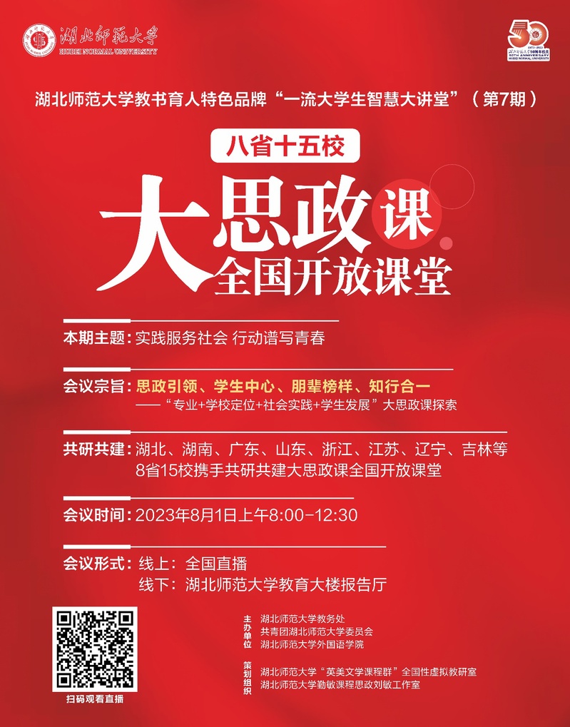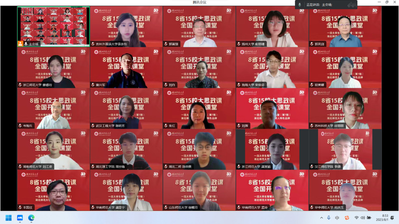 本网讯 为落实高校立德树人根本任务,引导广大青年学子自觉成为立大志、明大德、成大才、担大任的时代新人,8月1日,304am永利集团在教育大楼报告厅和网络平台举办教书育人特色品牌“一流大学生智慧大讲堂”大思政课全国开放课堂。来自湖北、湖南、广东、山东、浙江、江苏、辽宁、吉林等8省15所高校师生相聚云端,共同探索以“思政引领、学生中心、朋辈榜样、知行合一”为核心的“专业底色+学校本色+实践特色+学生发展”大思政育人模式。