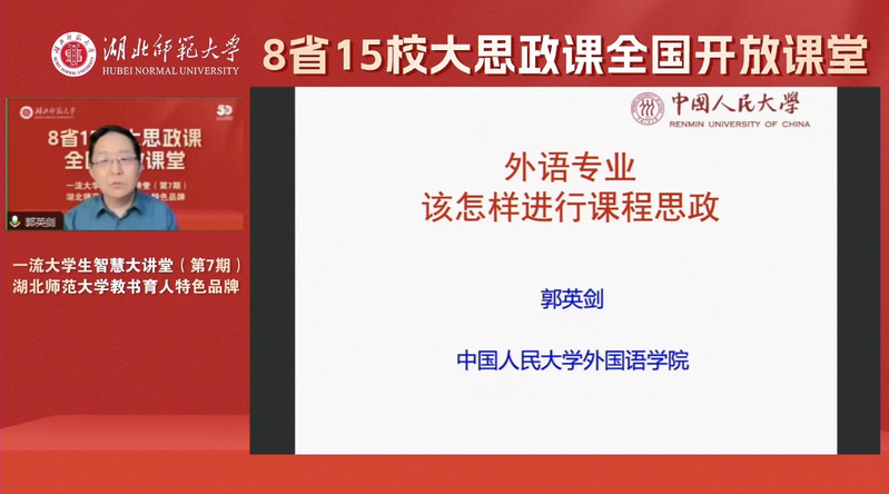 全国模范教师、教育部高等学校英语类专业教学指导分委员会委员、中国人民大学首都发展与战略研究院副院长郭英剑教授以“外语专业,该怎样进行课程思政”为题作大会主旨报告。他分享了课程思政经验并强调,“要讲好外语、讲好外语课,引导学生树立正确的三观,培养批判性思维能力;既要向中国讲好世界故事,也要向世界讲好中国故事;培养学生成为新时代阅读超人、思辨强人、国际能人和行动达人。”