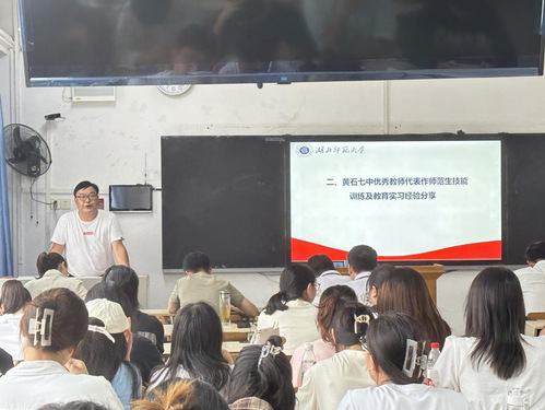 朱金华老师结合自己多年来指导实习生教育实习的工作经验,为毕业生分享教师技能培养及实习经验,他指出大学实习生在中学实习的优势与存在的问题,他从六个方面建议实习过程中要培养和学习的要点:一是不忘初心,坚守专业学习,扎根一线教学;二是树立自信,勇于拼搏、敢于挑战,同时也要严谨、认真、负责地对待教育教学事业;三是敢于创新,在班主任实习教育过程中要学会如何管理班级;四是不怕苦、不怕累、不怕吃亏,在实习中要谦虚多请教多学习;五是正确处理好与实习指导老师、与学生等的人际关系;六是练好“三字一画、掌握正确发声技巧,要善于观察学习一线教师的教学技能,提高师范生专业素养。