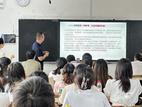 在毕业论文工作动员环节,系主任张畅介绍了教育部本科毕业论文抽检的精神、学校和我院关于毕业论文工作的制度安排和时间节点,要求同学们认真对待毕业论文工作,积极主动与指导老师沟通,在实习过程中注意结合毕业论文开展数据收集工作,争取提交一篇高质量的毕业论文。