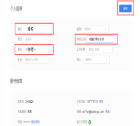 按统一规则修改个人信息,在“姓名”文本框中:录入自己的真实姓名,在“学校/公司”文本框中:录入自己所属学校名称,在“职位”文本框中:录入自己的学号,点击保存;