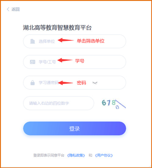 平台首页点击登录按钮,学习通扫码登录或者点击“其他方式登录”,单位框筛选所在高校名称,在指定位置输入学号和密码,切勿自行注册账号。