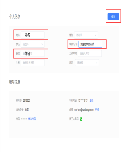 按统一规则修改个人信息,在“姓名”文本框中:录入自己的真实姓名,在“学校/公司”文本框中:录入自己所属学校名称,在“职位”文本框中:录入自己的学号,点击保存;