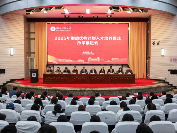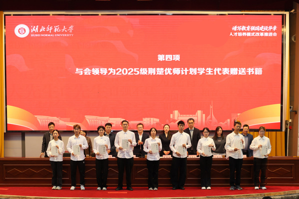 本网讯 10月23日下午,学校在教育大楼报告厅召开2025年“荆楚优师计划”人才培养模式改革推进会。校党委副书记、校长雷儒金出席会议并讲话,校办公室、宣传部、学工部、教务处、教学质量监测与评估中心、人事处、招就处、教师教育学院等职能部门负责人,各相关培养学院班子成员及2025级“荆楚优师计划”全体学生参加会议。会议由校党委常委、副校长胡艳军主持。