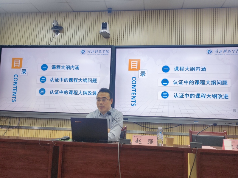 近日,学校在教育大楼1316A会议室召开专业认证背景下的课程大纲微认证报告会。会议特邀湖北科技学院教育学院赵强副教授作专题报告。校级教学督导,相关师范专业负责人、系主任及专任教师,公共课开课单位课程负责人,教务处和教学质量监测与评估中心工作人员出席会议。会议由教务处副处长袁蓓主持。